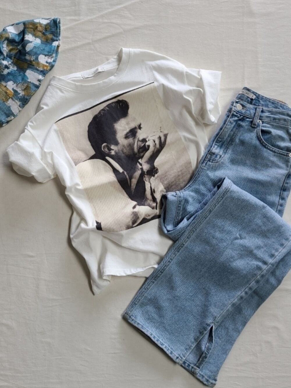 サイドにスリットが入ったきれいなシルエットのハイウエストデニムパンツ × フロントのモノクロフォトプリントがトレンド感溢れるオーバーTシャツ × シンプルコーデにも着映えするアートペイントがかわいいバケットハット