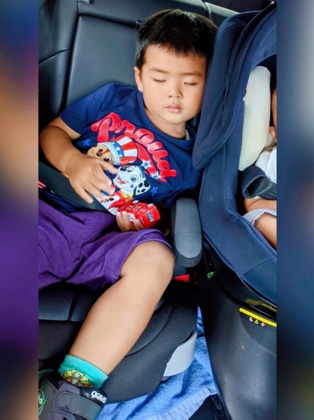 出産してからずっと休んでたWEAR お腹から出てきたのはこの子 3歳にして100cm 17kg 友達の車で堂々と寝る立派な息子である パウパトが好きで映画に行ったこの日