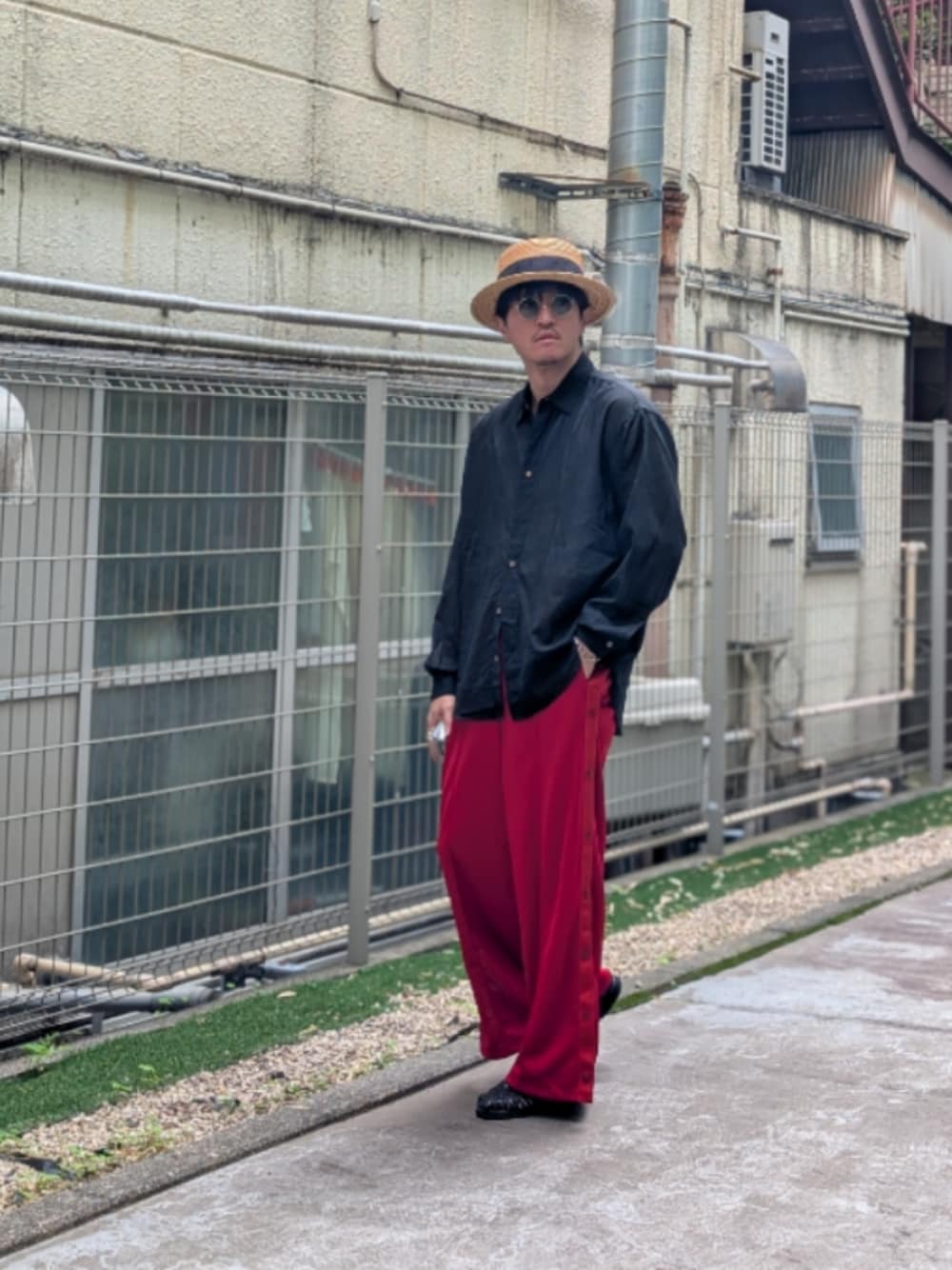 赤いジャージをベースに黒でまとめるコーディネート! カンカン帽で夏を先取り。 シャツも重たくならないようにシアー素材で。