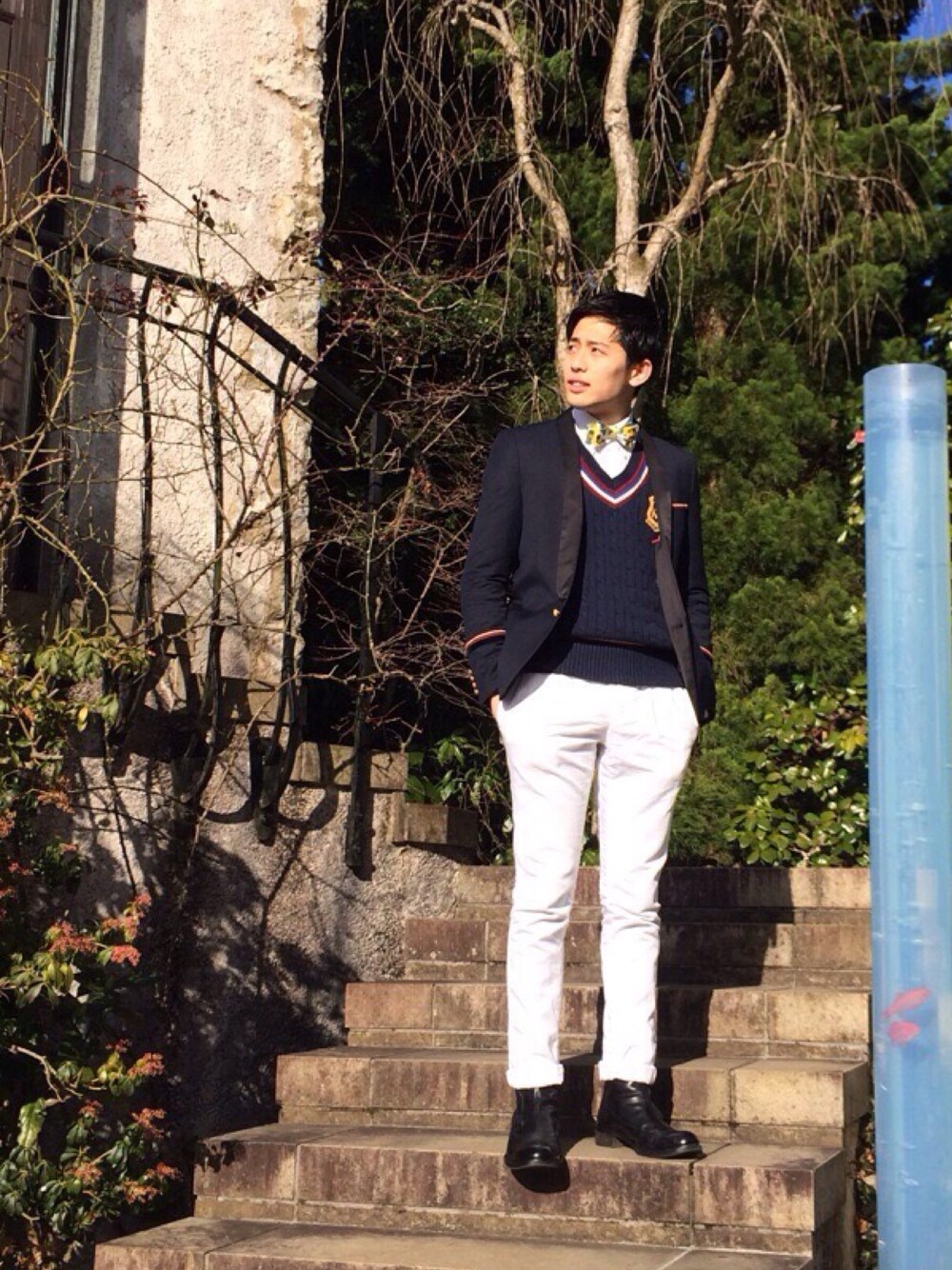 少し気合の入ったパーティボーイをイメージしました。 分かりにくいですが綺麗な色をしている蝶ネクタイをポイントにまとめてみました。