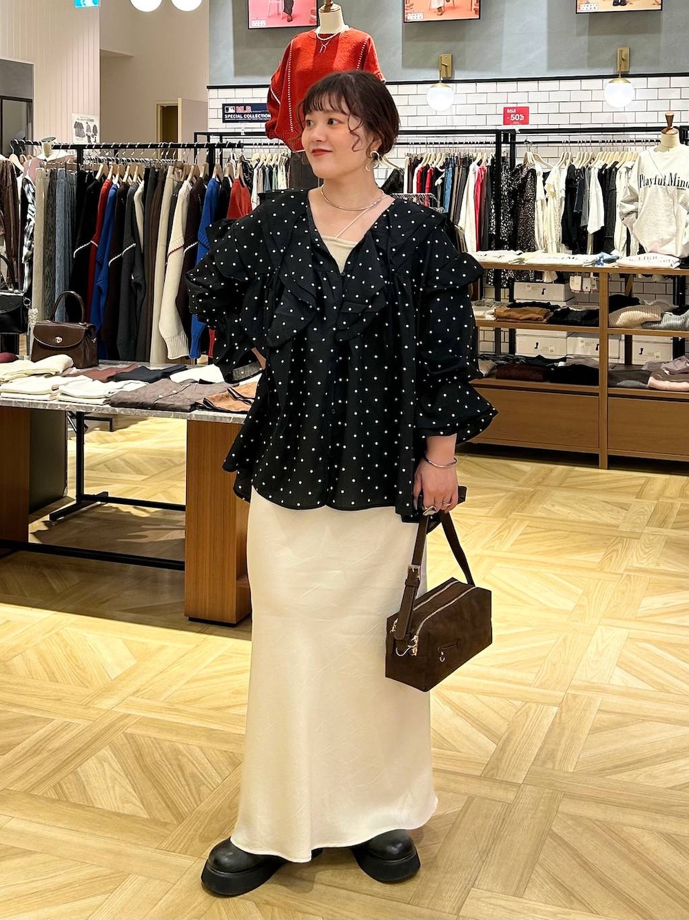 甘めブラウスを使ったキレイめコーデ♡ 【トップス】 新色のドット柄♡ 大きなフリルが特徴のブラウスは 首元がVネックで顔周りすっきり◎ チュニック丈だから もちろんお腹・腰・おしり周りはカバーしてくれて キャンディースリーブで手首まで細く見える♡ パンツスタイルだけでなく スカート合わせでも着ていただけます! 【スカート】 程よい光沢感と素材の落ち感が上品な印象に◎ ウエストがオールゴム使用で楽ちん! 腰回りの程よいフィット感がセミフレアのシルエットを生かして着痩せ効果抜群のスカートです! 今回はルーズに履きたかったので Lサイズで履いてみました!
