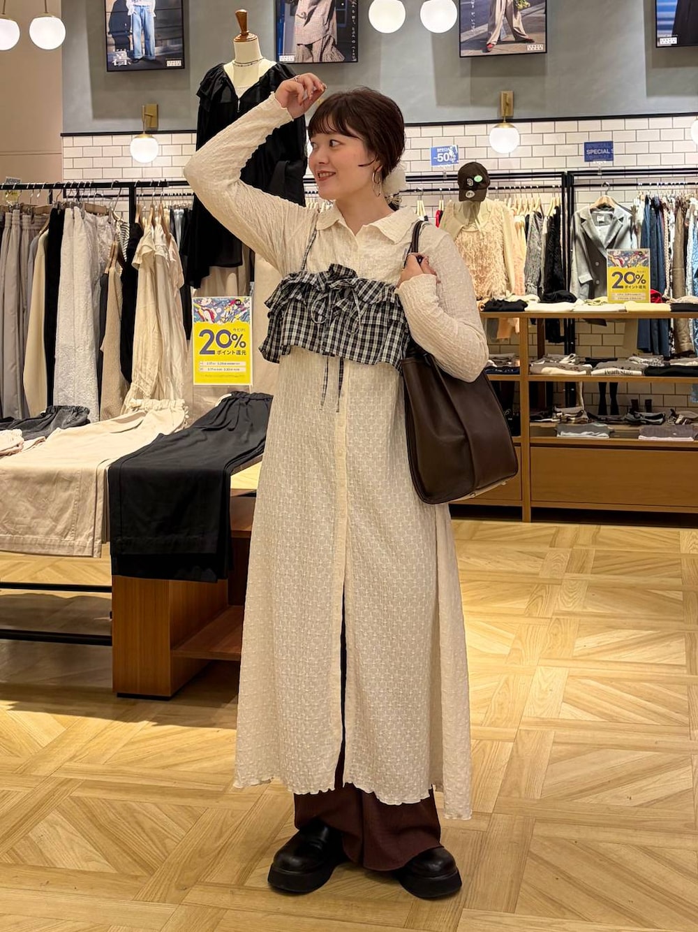 店頭リアルバイコーデ♡ 【ワンピース】 フレアシルエットのカットポロワンピース♡ 二の腕周りや肩幅は程よくコンパクトなサイズ感ですが 意外と身体のラインがきになりにくい ややゆったりめなシルエットなので ぽっちゃりのわたしでも気にせず着れた◎ ぺチワンピ付きなので一枚でもOK👌🏻 スタイルアップさせるために ビスチェをプラスして 胸周りの体型カバーと ウエストの位置も高く見せました!