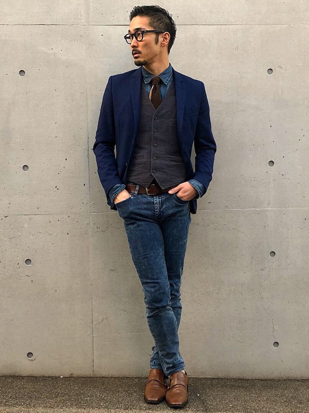 イタリアのおじさん達のど定番、アズーロエマローネ😎♪ 要はブルーとブラウンのコーディネートのこと☝️ ネクタイ、ベルト、革靴の色を合わせるのは基本中の基本😉✨ またシャツとパンツをデニムで合わせてるのも遊びポイント✌️ ベストを着ることで、カジュアルになり過ぎず、オフィスシーンでもいけちゃいます!