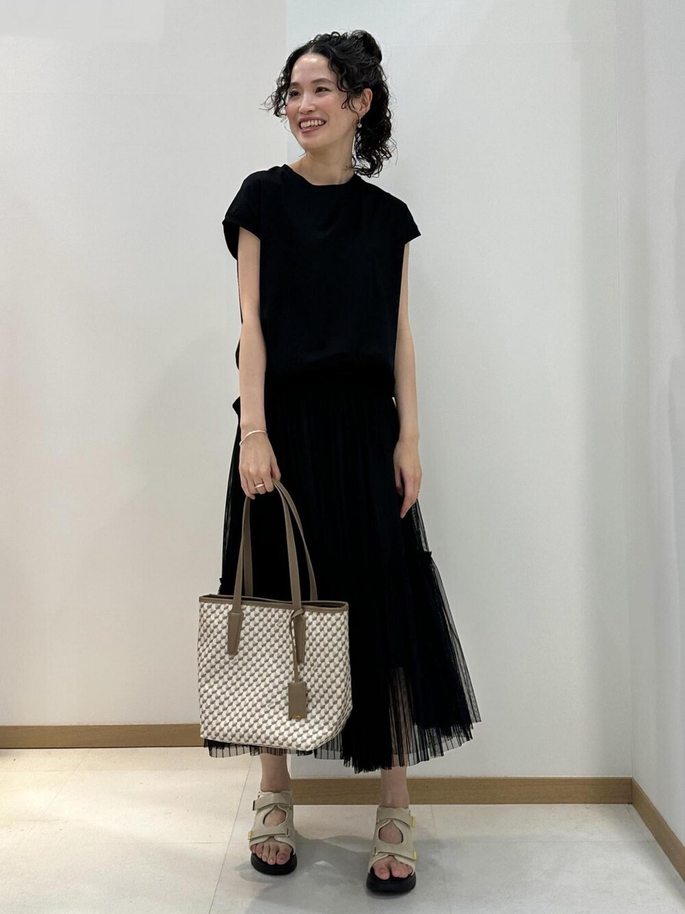 素材感が軽やかなスカートはトップスにブラックを合わせてオールブラックコーデにしても重い印象になりません。 小物にベージュを合わせて上品な印象に仕上げました。 ※店頭及び野外での撮影画像は、 光の当たり具合で色味が異なって見える場合がございます。 商品の色味はスタジオ撮影の画像をご参照ください。 LINEでロペスタッフに相談は【友だち追加】をタップをして下さい <a href="https://lin.ee/oQtrrAP" style="background:url(https://scdn.line-apps.com/n/line_add_friends/btn/ja.png); background-size: contain; display: block;width: 116px;height: 36px; margin:.5em 0;"></a>