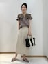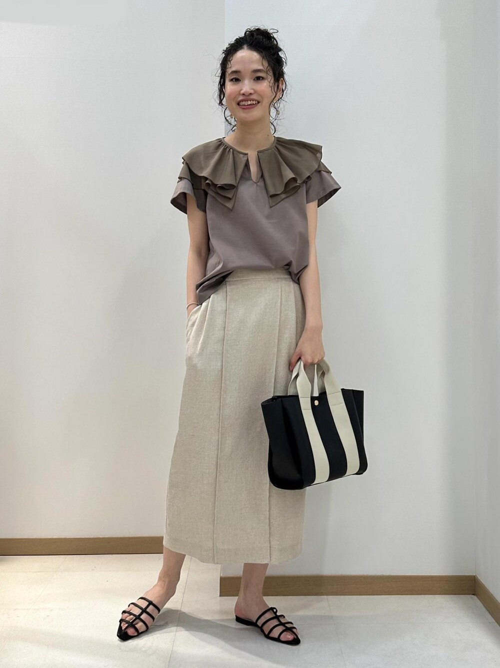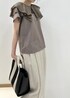 フリルが可愛らしいトップスを大人っぽいカラーでコーディネートしました。 トレンドのビッグカラーも大人っぽいカラーで合わせれるとぐっとこなれた印象になるのでおすすめです。