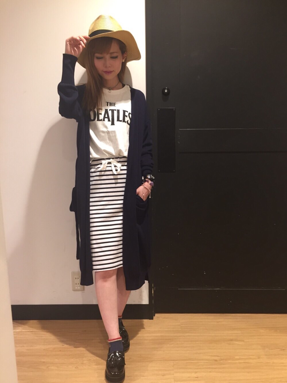全身ライトオン!! 今回は ビートルズのTシャツw カジュアルに着こなすために 麦わら帽子をかぶりました。 今回も足を細くみせるために 活躍してくれたのは 厚底ローファーです。