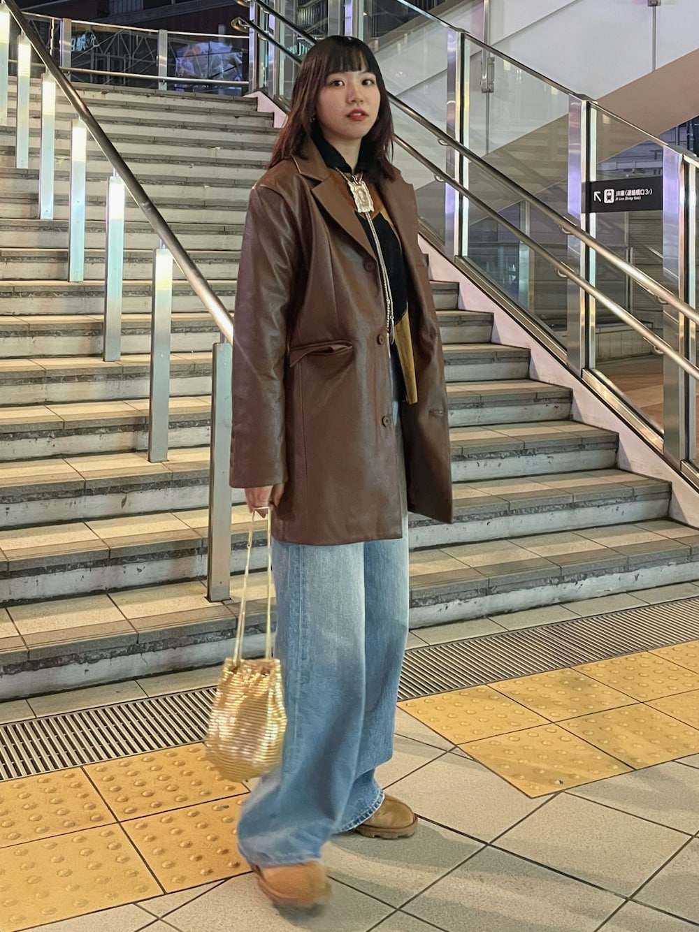 moneのテーラードジャケット「VEGAN LEATHER LONG TAILORED JACKET (SET-UP) / フェイクレザーロングテーラードジャケット (セットアップ対応)」を使ったコーディネート