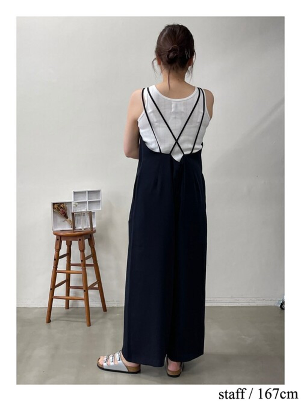 staff :mami すっきりとしたVネックで、ルーズすぎず裾にかけて 肩紐のアジャスターをよりすっきとしたデザインにアップデート。 バックのクロスデザインで後ろ姿もしっかり可愛いアイテムです。 160CM以下の方はヒールで合わせていただくと 丁度よい丈感で着用できます!