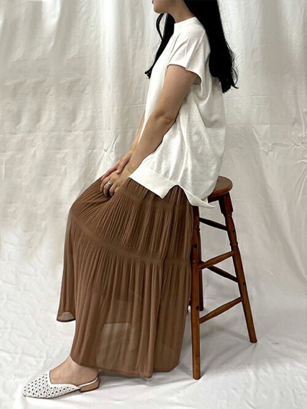 staff : risa 歩くたびにふわっと揺れる、シフォンスカート🍞 ウエストゴムで楽な気心地も魅力的で、 Tシャツやブラウスと合わせてカジュアルにもレディにも 幅広い着こなしを楽しめるアイテムです✔