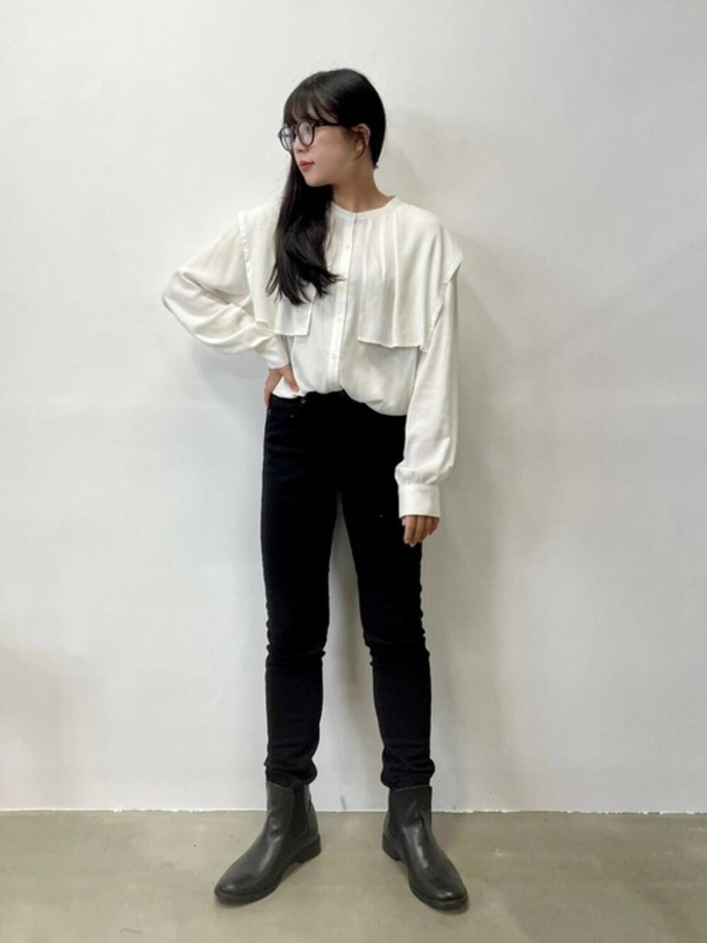お顔周りをスッキリと見せるスタンドカラーに 女性らしいケープデザインが可愛いシャツブラウス。 レディにまとめてもよし、カジュアルに落とし込んでもよしな 今季一枚は持っておきたい万能アイテムです✨ staff : 155cm