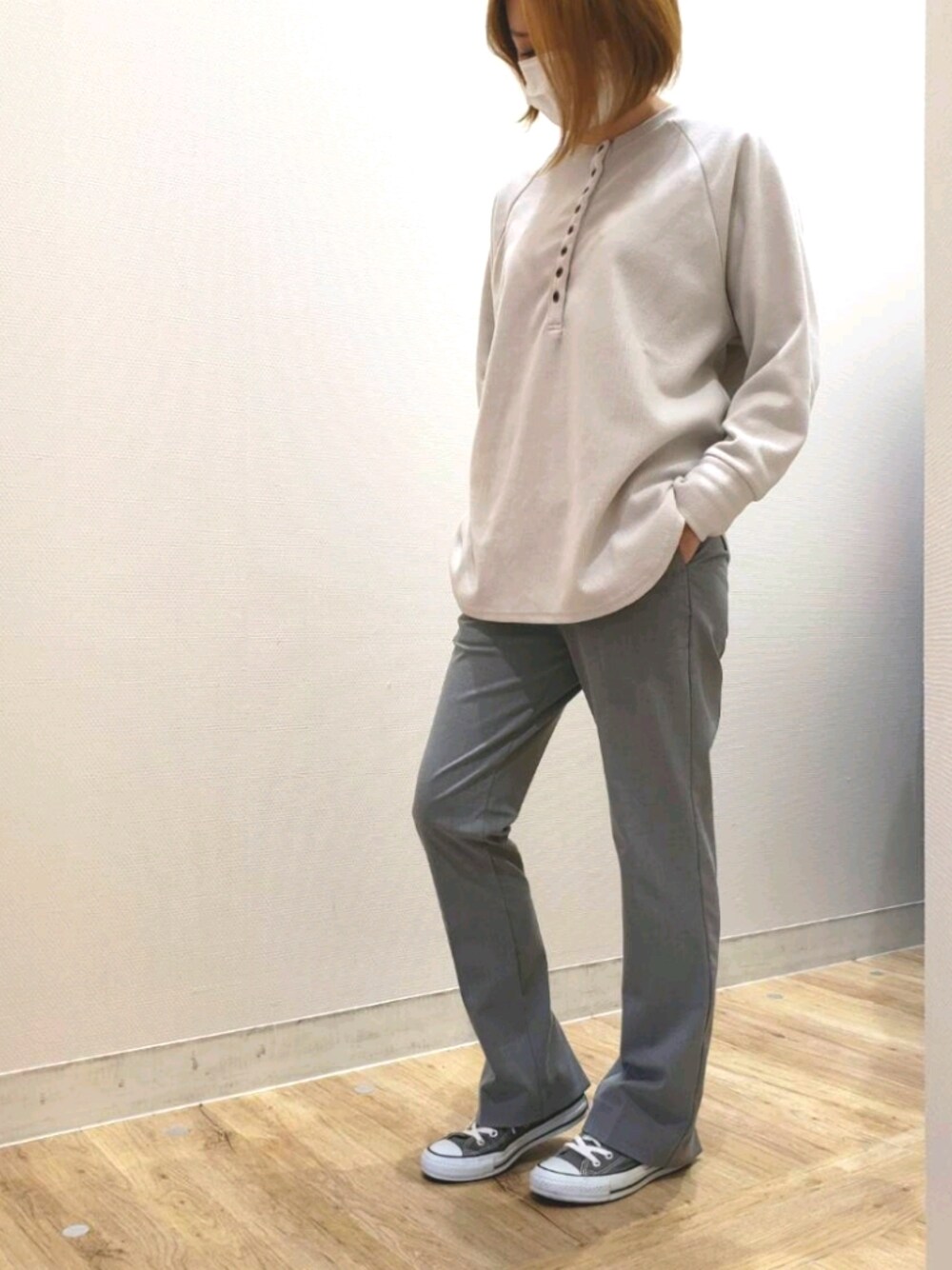 omneskumamotoのトップス「ウールタッチリブニットヘンリーネックプルオーバー (グレージュ)¥3960」を使ったコーディネート