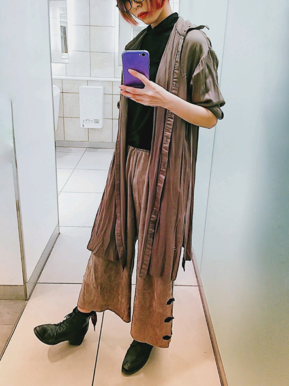 カーキロングシャツ×ワイドパンツ シャツはテロ素材 パンツはチャイナボタンがポイントでピーチスウェード 異素材あわせのゆるゆるコーデ💕