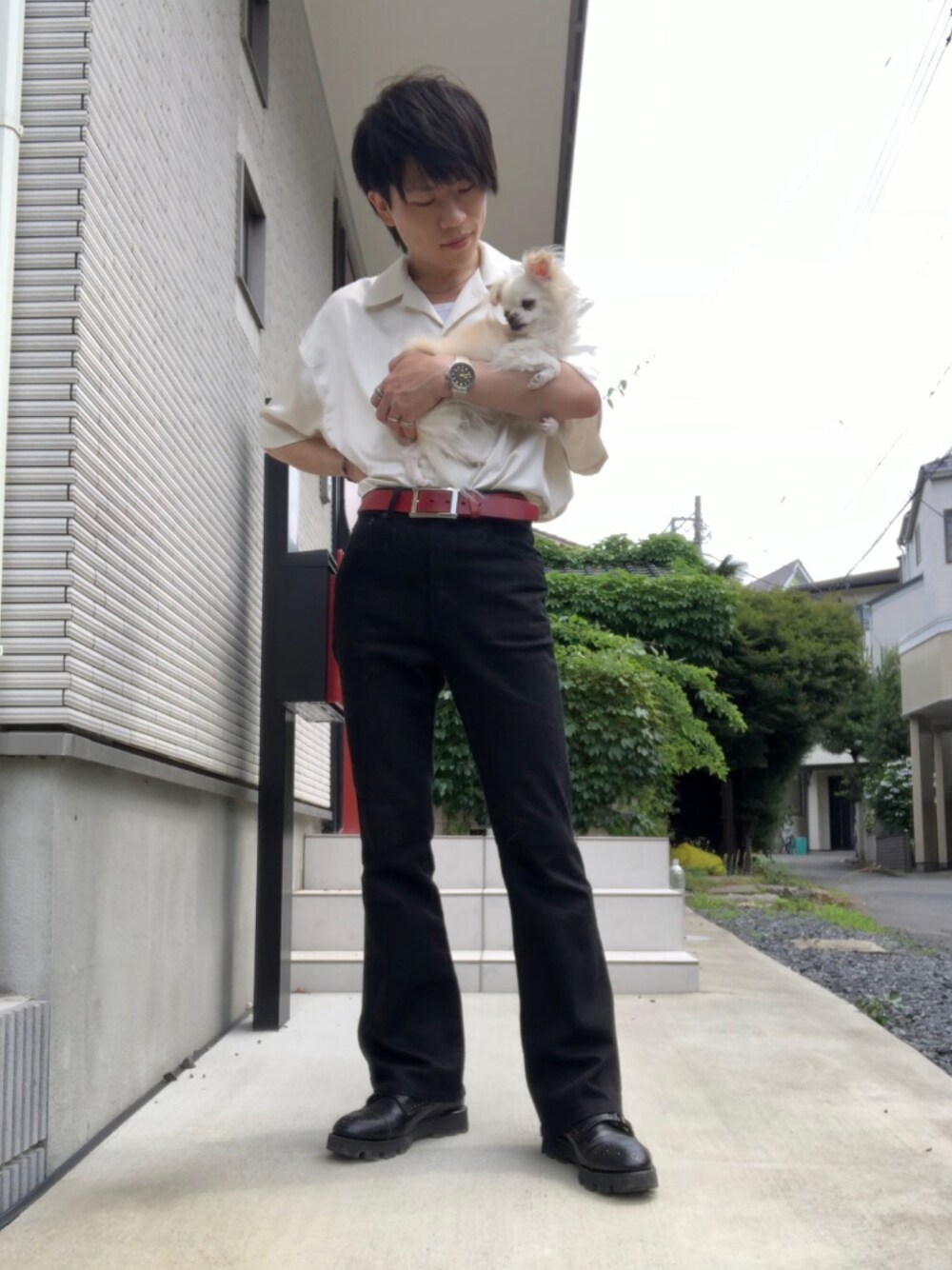 シンプルコーデ✨ 妻から貰った赤いベルトを主役にしたかったので、 その他のアイテムはモノトーンで纏め タックイン 🤍 🟥 ♠️ 毎日おもちと仲良し❤️