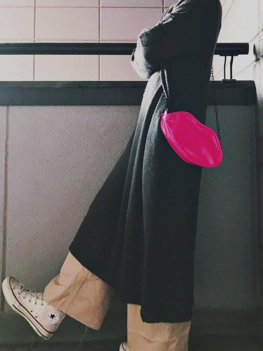 この間の休日のコーデです。 子供と朝から公園だったので手ぶらで 楽チンに。 このくちびるポーチはDAISOで300円でした😂 もう一つ小さいのは200円でした❤️ 一応スマホポーチらしいです。