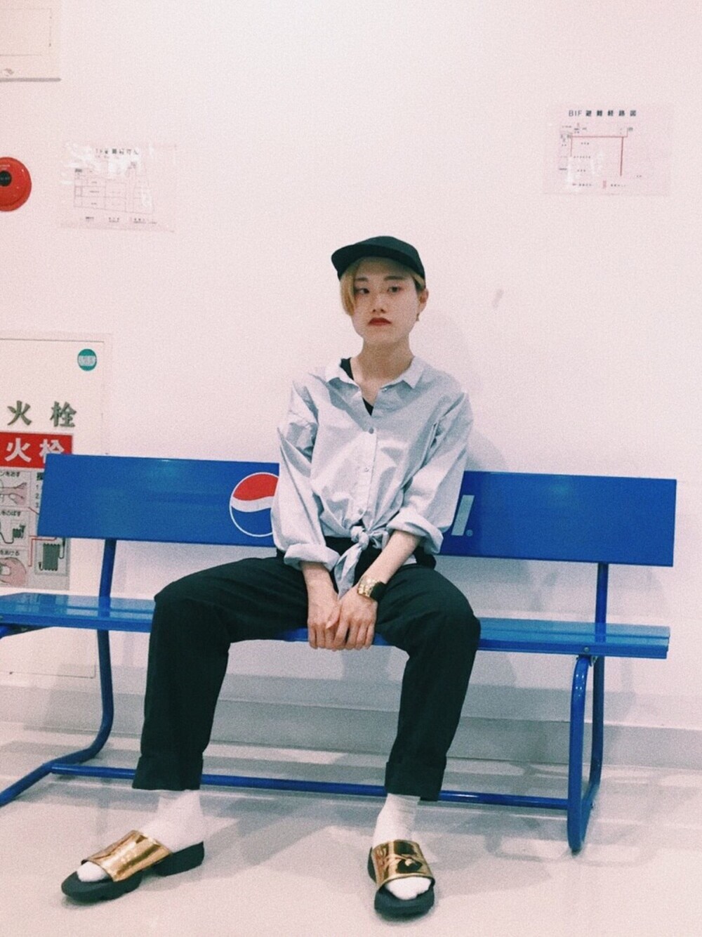 ボトムスはUNIQLOとLEMAIREのコラボパンツ 夏なのでキャップ そういえば、金髪にしました