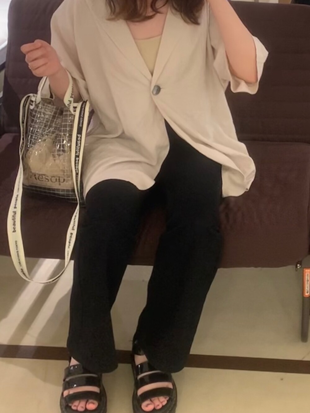 kyokoのショルダーバッグ「【beautiful people(ビューティフルピープル)】《STUDIOUS別注》ビニールサコッシュバッグ」を使ったコーディネート
