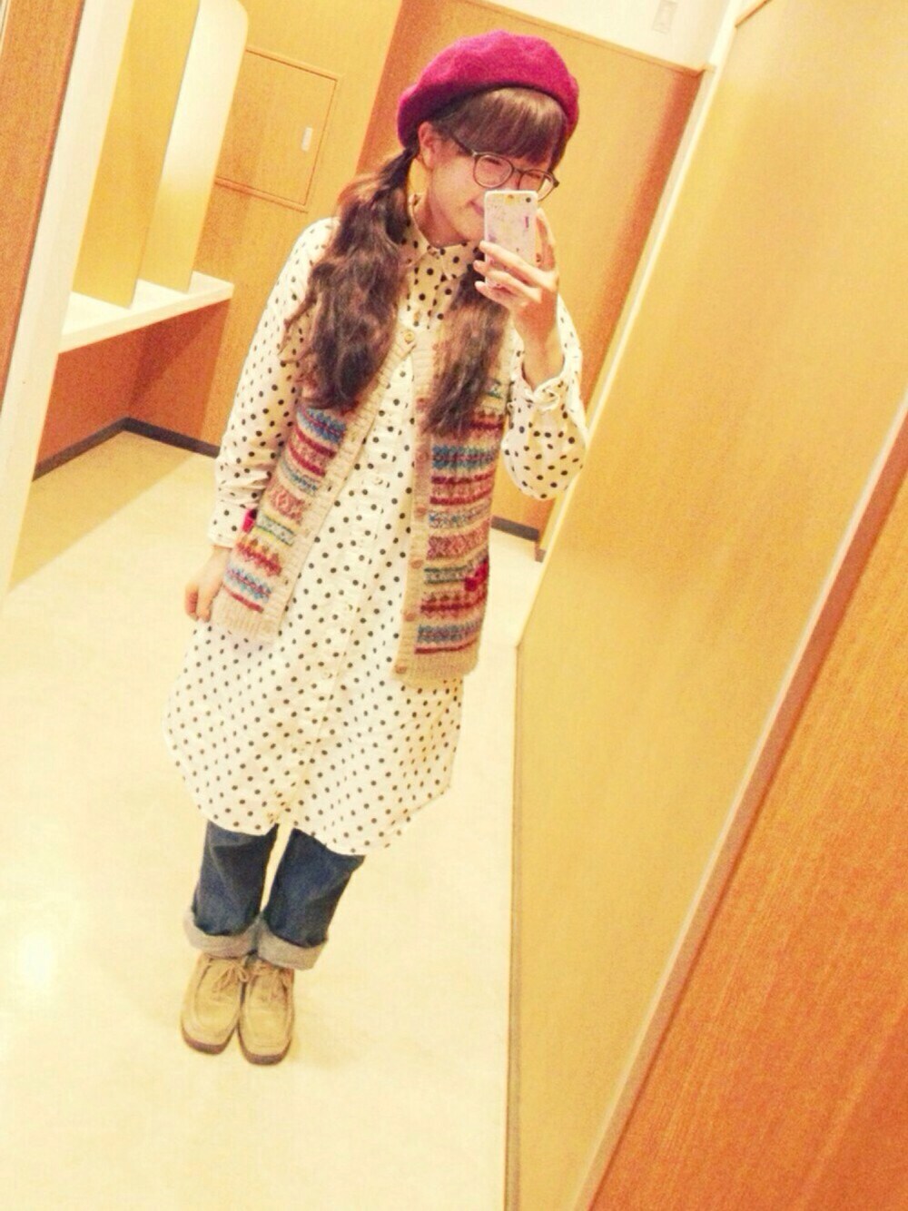 ベージュ系のベストを着用したレディースの冬コーディネートの1枚目の写真