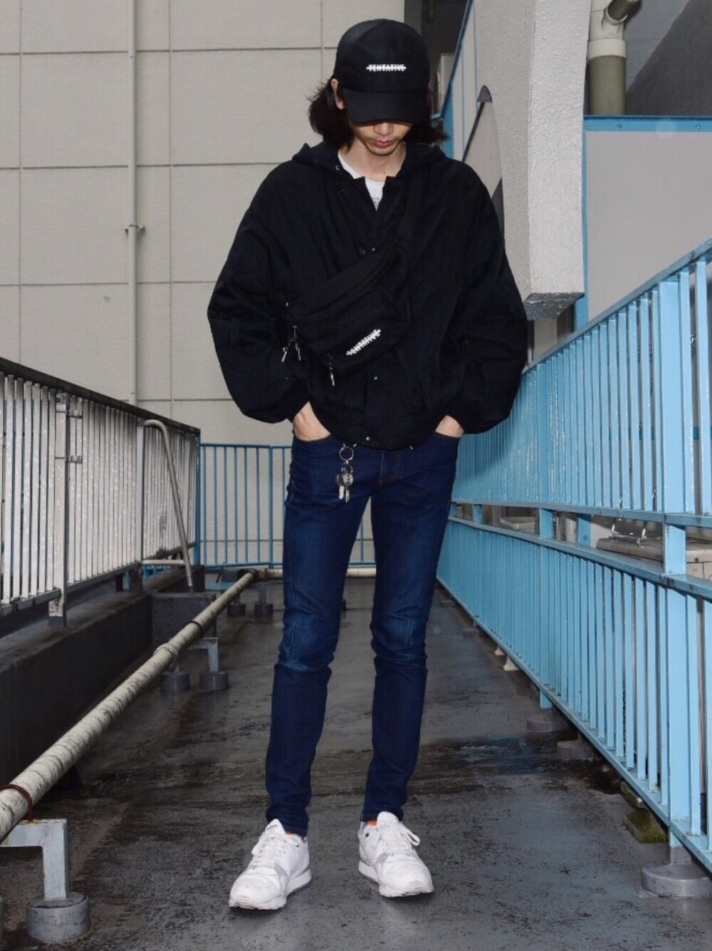 黒系とインディゴの合わせ、どこか抵抗があるんですが白スニーカーとソックスの差し色でバランスをとりました。