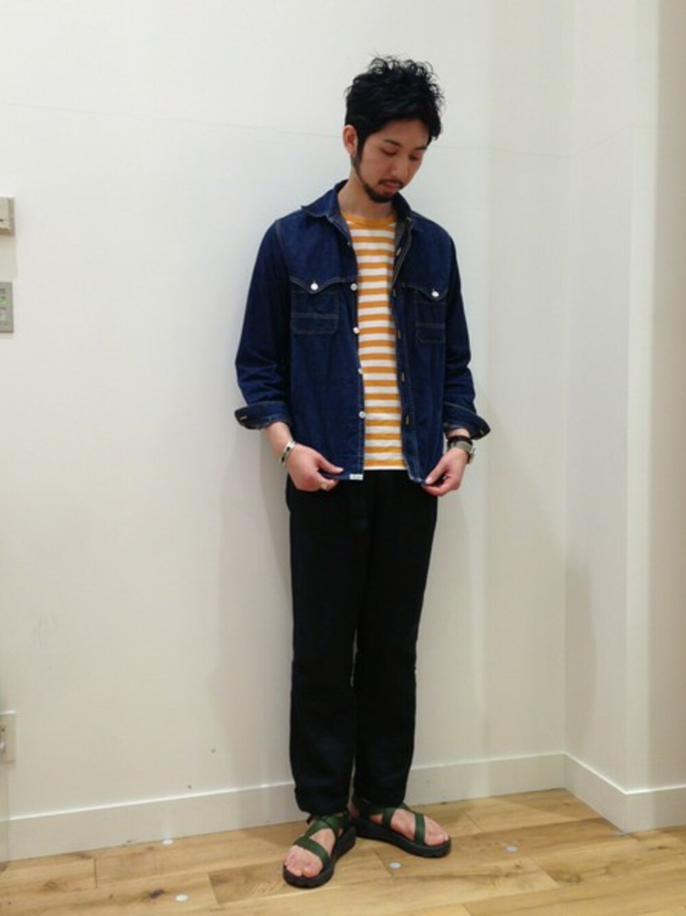 インナーのオレンジが映えるコーディネートです。 こちらのTシャツは色違いでも欲しくなりますよ。