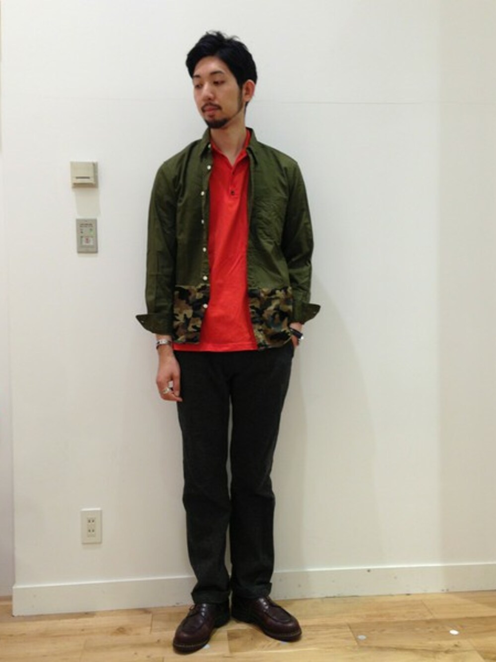 カーキ×カモフラのバイカラーシャツを秋らしいカラーリングでコーディネート。