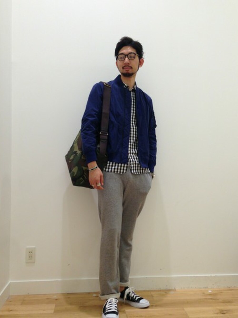 細身のスエットパンツをトラッドなアイテムなどで合わせた 秋のワンマイルコーディネート。