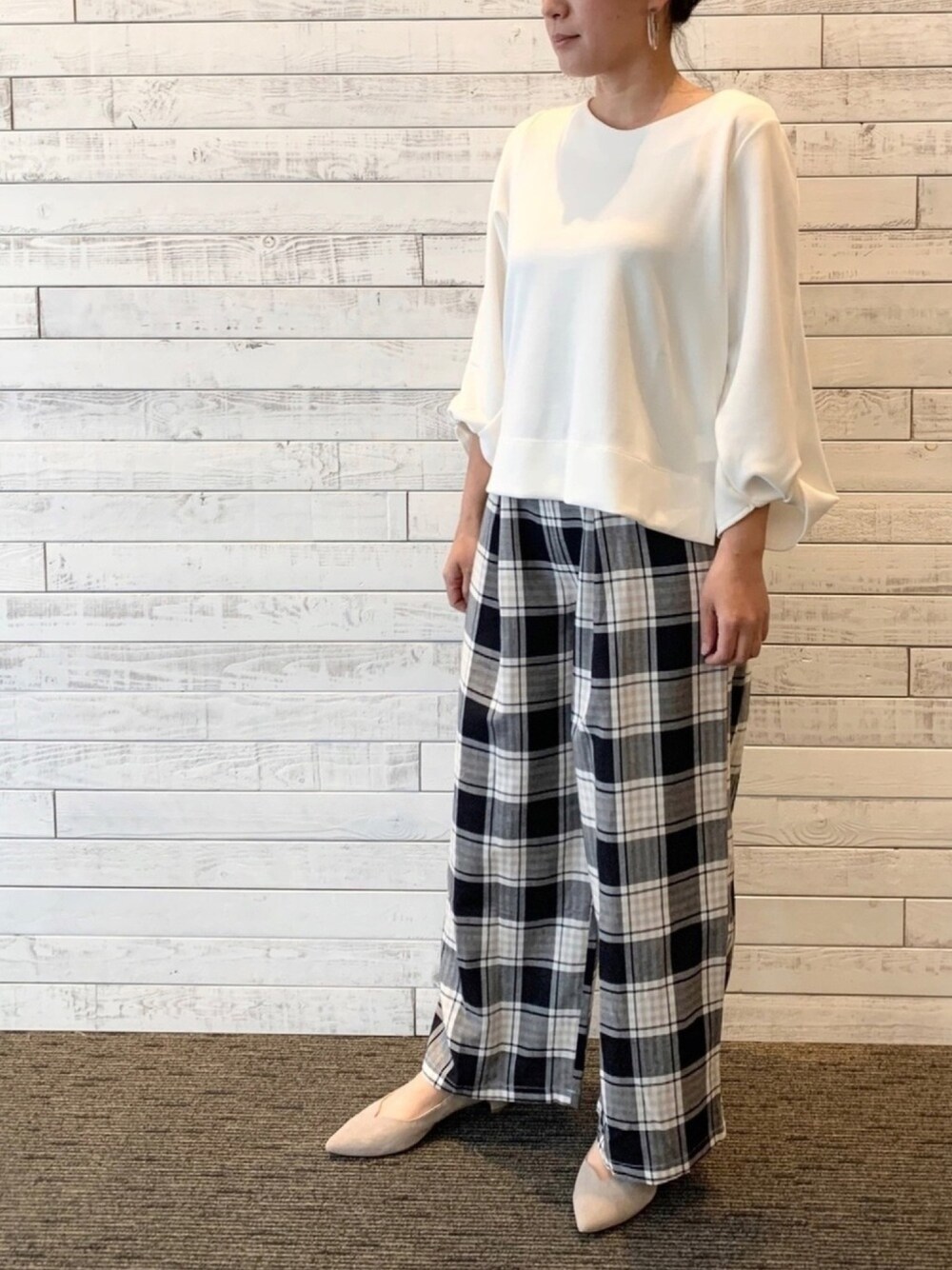 着心地のいい綺麗めカットソーにリラックス感のあるチェックパンツのコーデ♪ トップスはシンプル綺麗め素材なのでリモート会議にも対応可^_^ テレワーク中もゆったりした気分でお仕事できますよ◎