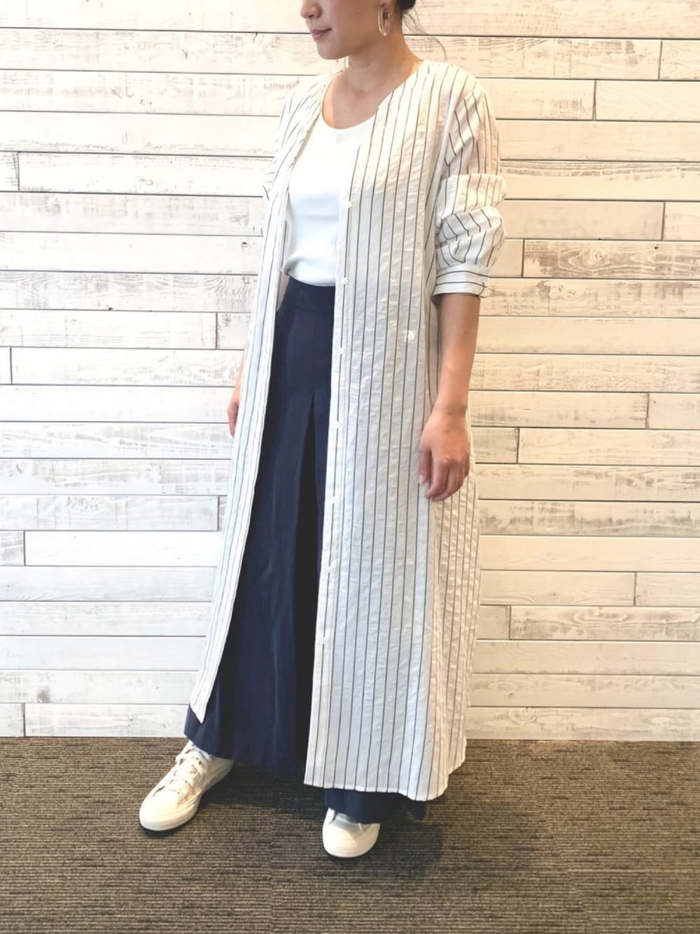 羽織にもシャツワンピにも使える(カシュクールにも)3wayシャツワンピはこの時期大活躍♪インナーは白とネイビーの合わせで爽やかコーデ◎