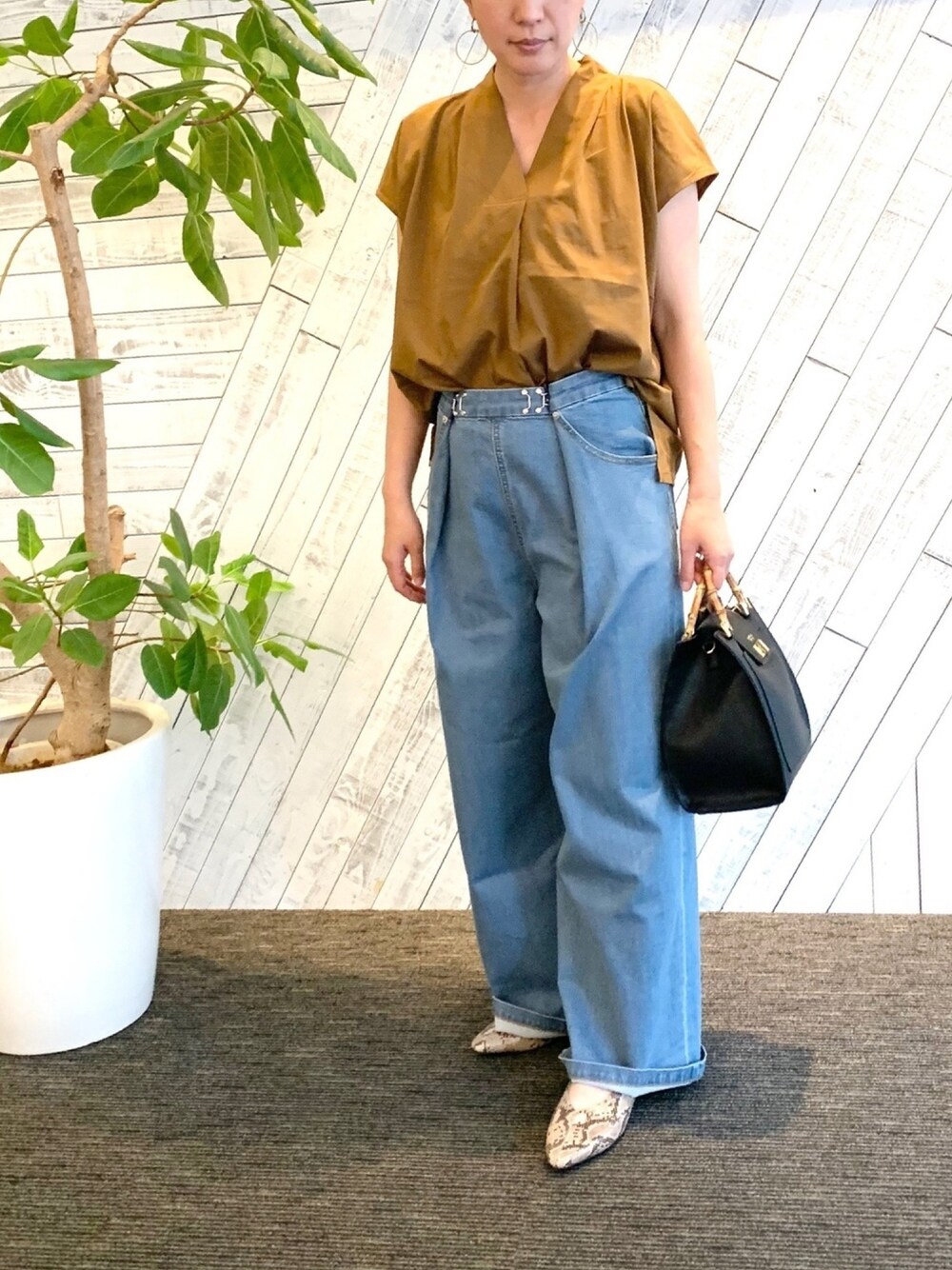 綺麗め素材のトップスとデニムで大人カジュアルスタイル♪ パンプス合わせでお仕事にも◎