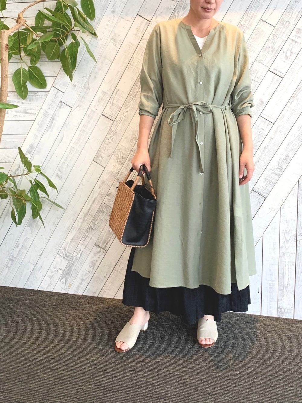 一つ前の投稿の色違い♪ ボタンを止めてワンピとして着用◎ プリーツワイドパンツと合わせでゆるっと楽チンコーデに◎
