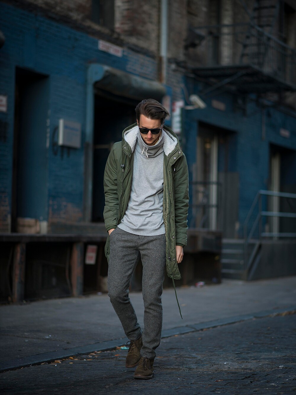 Wool pants, a cashmere turtle-neck, and an oversized parka