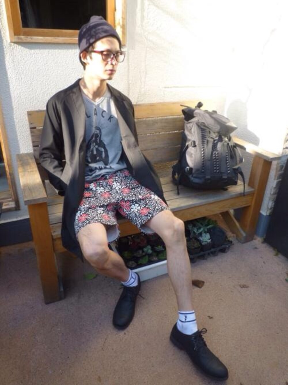 ショップコートと花柄のクロップドパンツをあわせたストリートコーディネート。スタッズリュックをアクセントに^_^