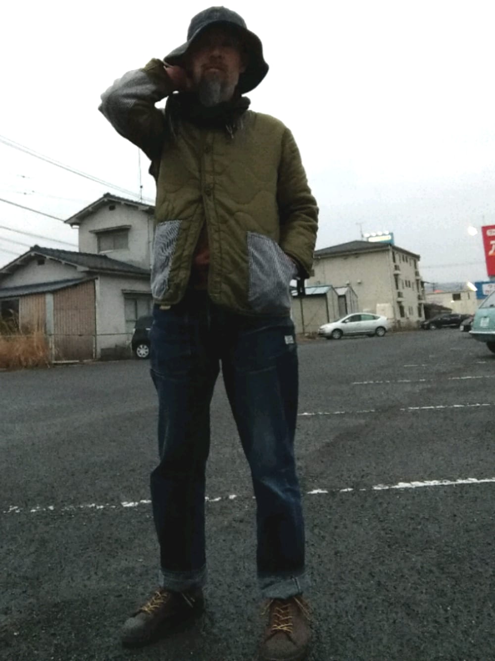 デニムハット:FULL COUNT アウター:US.M65.フィールドジャケットライナー リメイク オーバーオール:Old Betty's スニーカー:ASICS