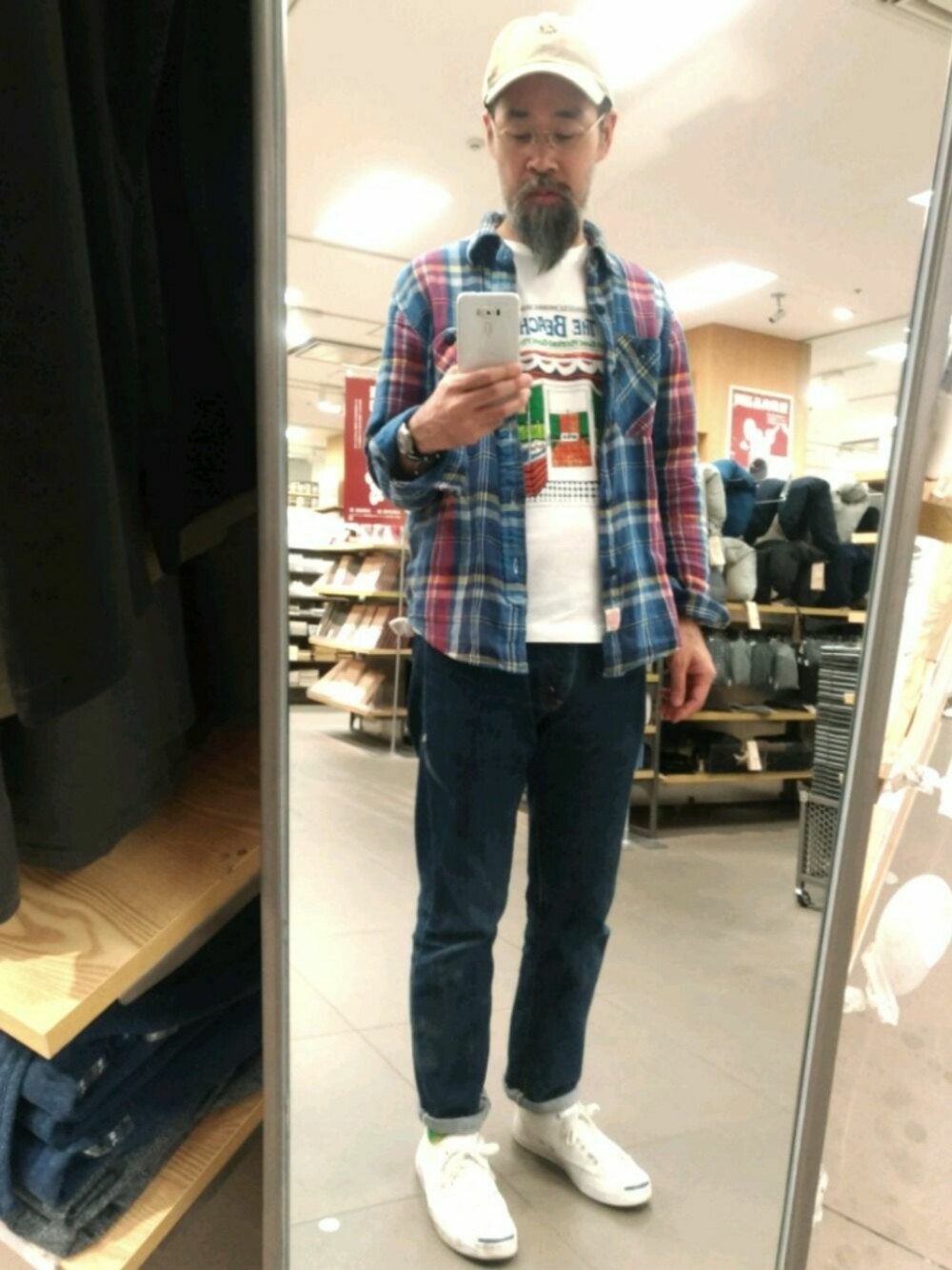 ユニクロのTシャツでビーチボーイズのスマイルジャケTシャツが 売り出されるようになるとは…スゴイ時代になっちゃったなあ… ペットサウンズのTシャツといっしょに買いました。 サイズで迷ったけど、結局ジャストのMで。 チェックガーゼシャツ:EDWIN OVER WORKS FACTORY デニムパンツ:リーバイス505