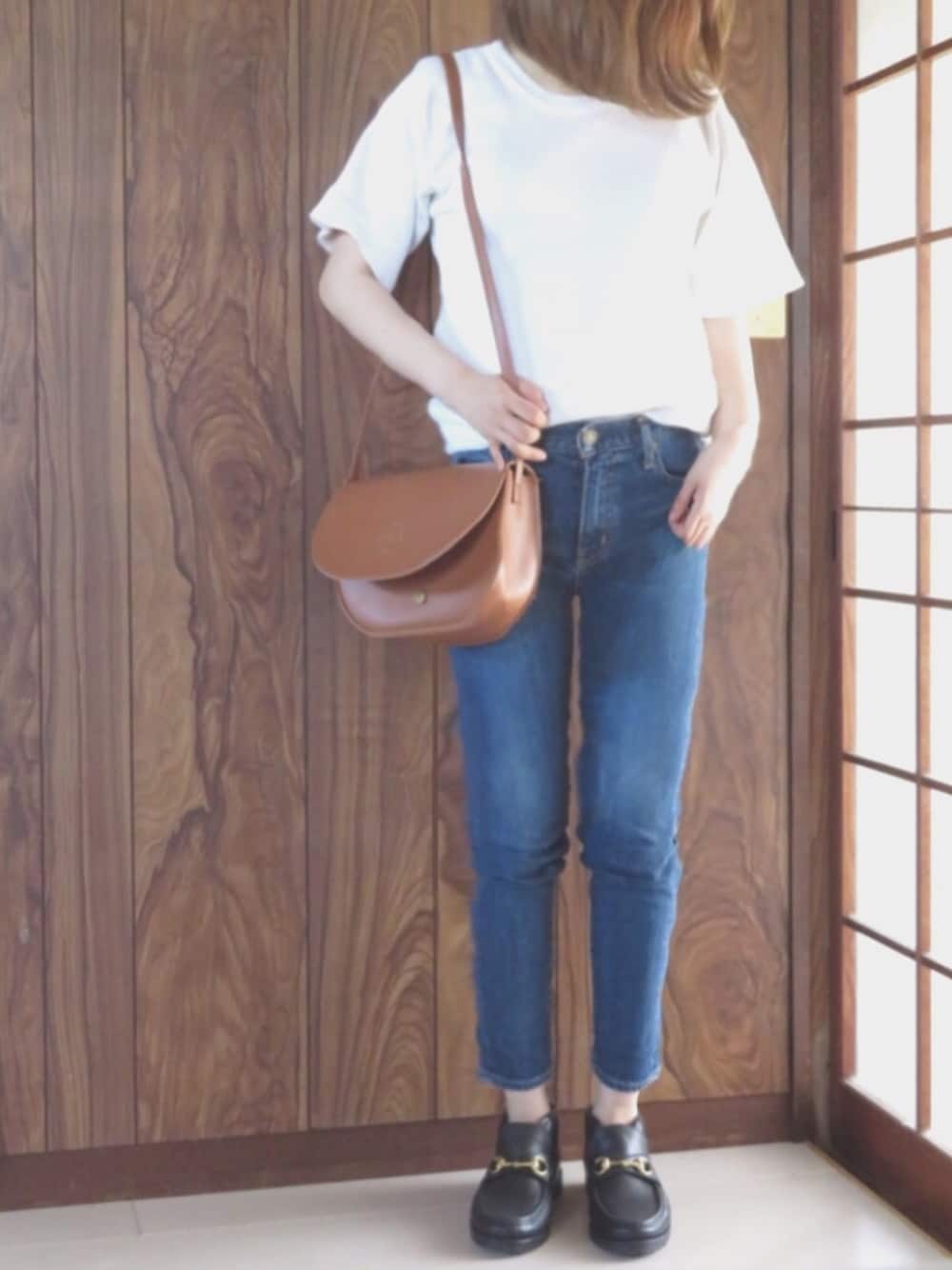 ててのデニムパンツ「ストレッチテーパードデニム」を使ったコーディネート