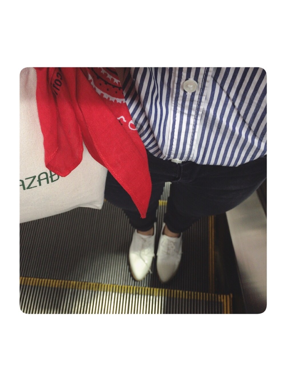 シャツイン😁😁 重苦しさを無くしたよー! カバンと靴は同系色~ はやりのバンダナを取り入れました!😆😆