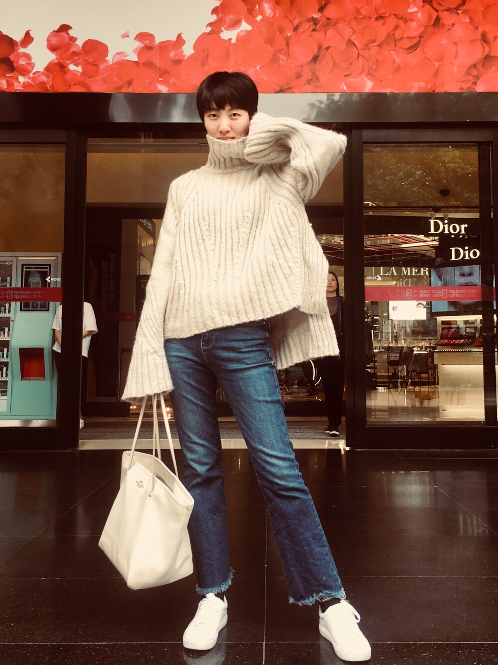 高领大毛衣+微喇牛仔裤+小白鞋,简单又温暖的搭配