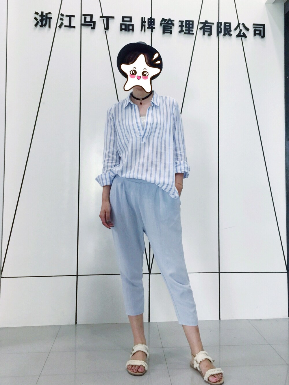 蓝白条纹棉麻衬衫+蓝色休闲裤+米白色棉麻平底凉鞋 灰色草帽增加时髦度,衬衣塞到裤子里拉长比例
