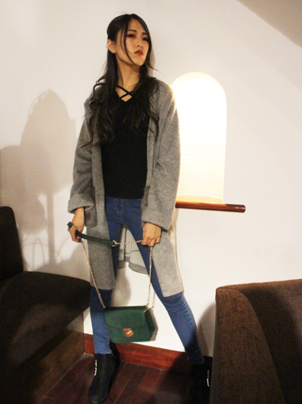 ファーポケットがポイントのコーディガンはシンプルに合わせて大人なスタイリングに👠✨ グリーンのバックでアクセントをプラス💕