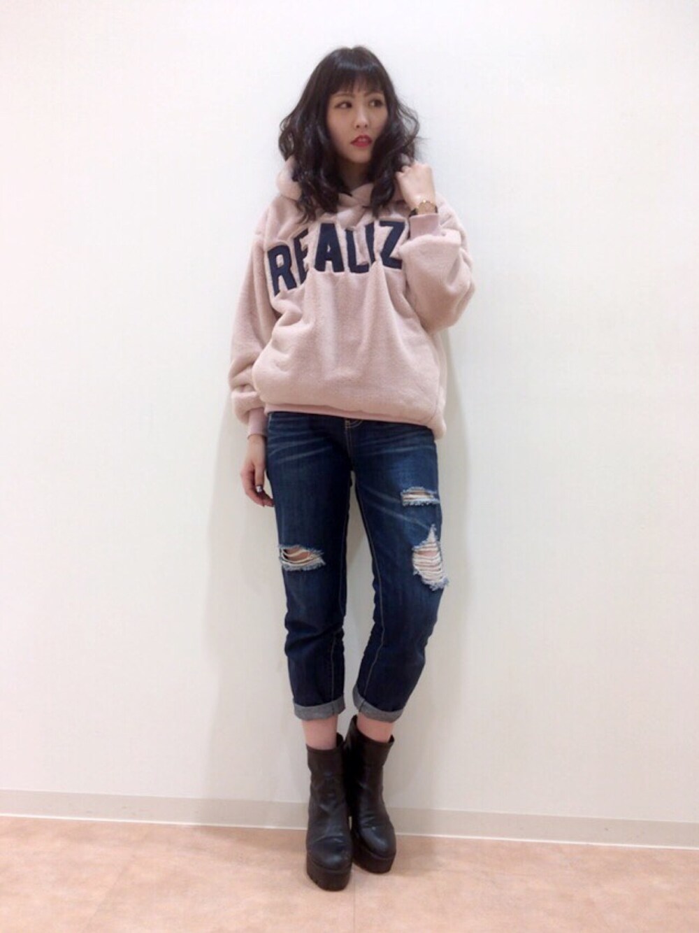 onewayのパーカー「ファーロゴフードパーカー」を使ったコーディネート