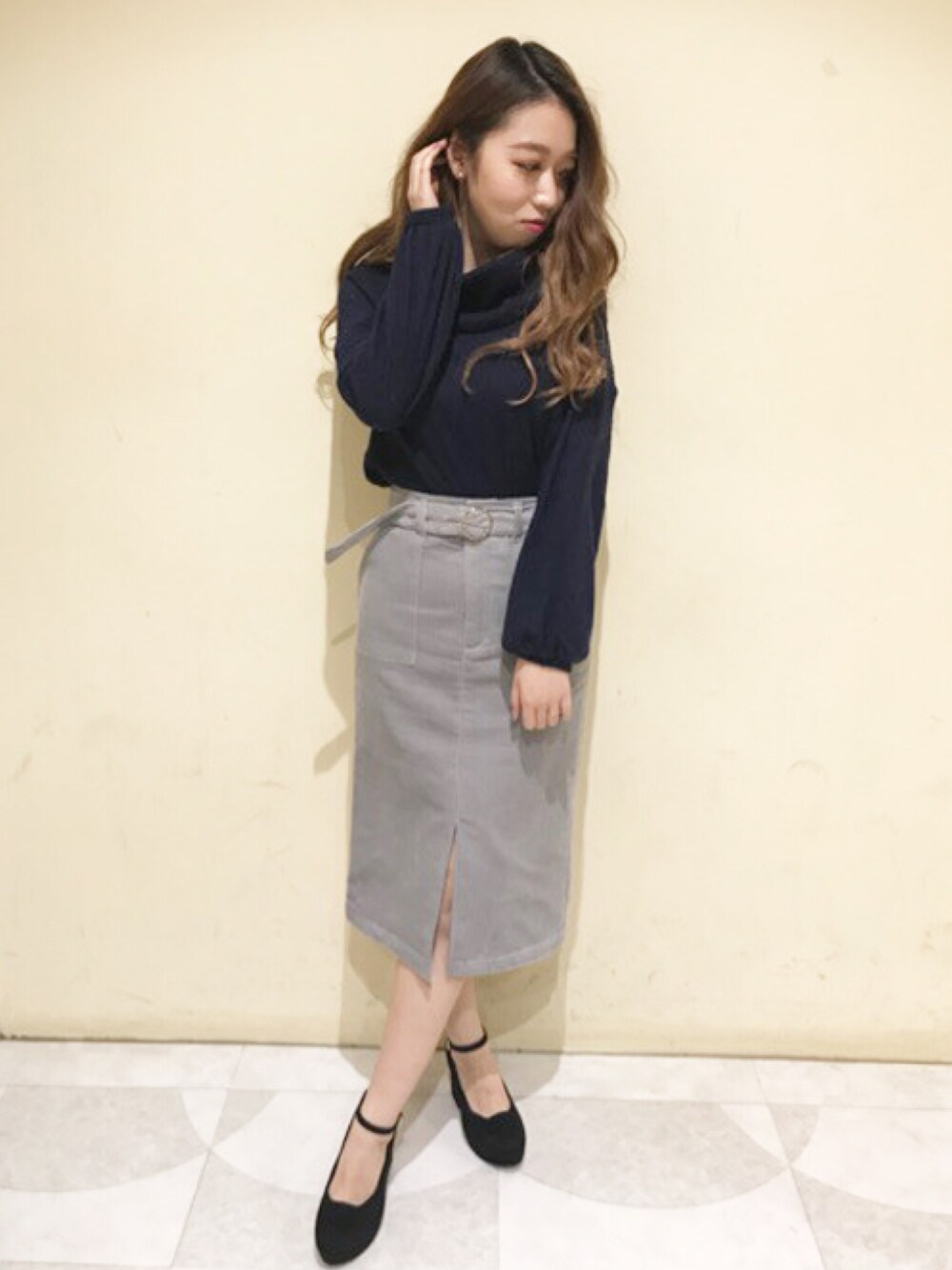 大人っぽいミドル丈スカートはオフタートルのトップスと合わせるのが🙆✨ ウエストマークも付いて脚長効果もバツグン✨✨