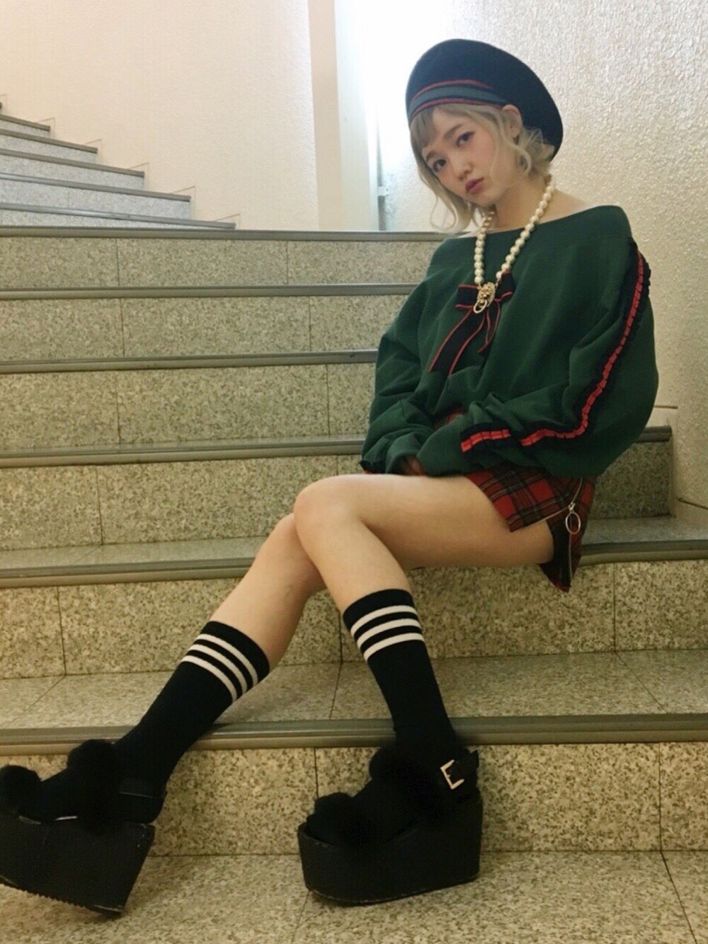 ライン配色が可愛いベレー帽はCUTEさをプラス😍💕チェック柄スカートとの相性も抜群です👌✨
