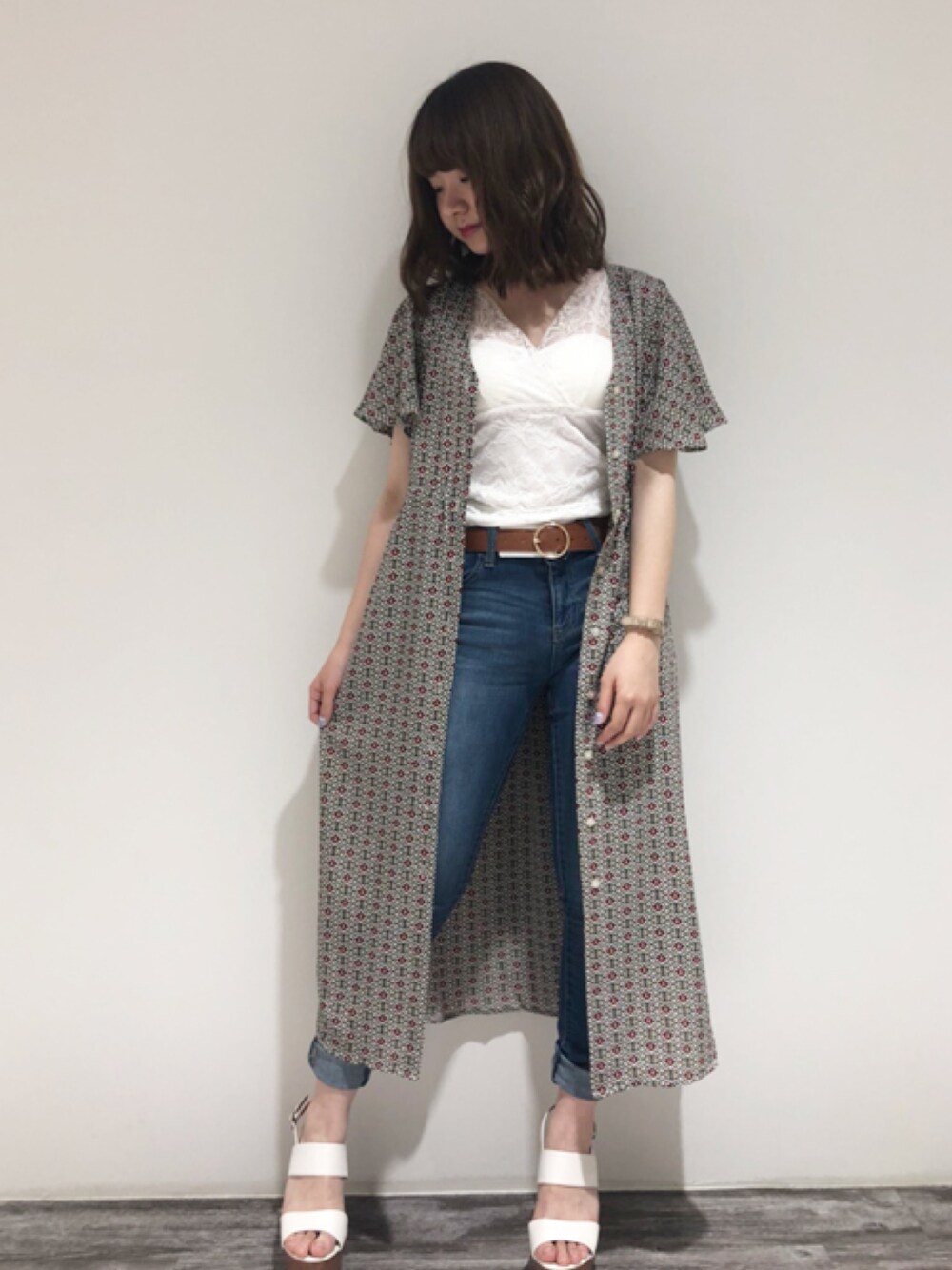 総柄のシャツワンピースは羽織るだけでトレンド顔に😊✨ 総レースのキャミソールをインナーにすることで女性らしさをプラス🙆‍♀️✨