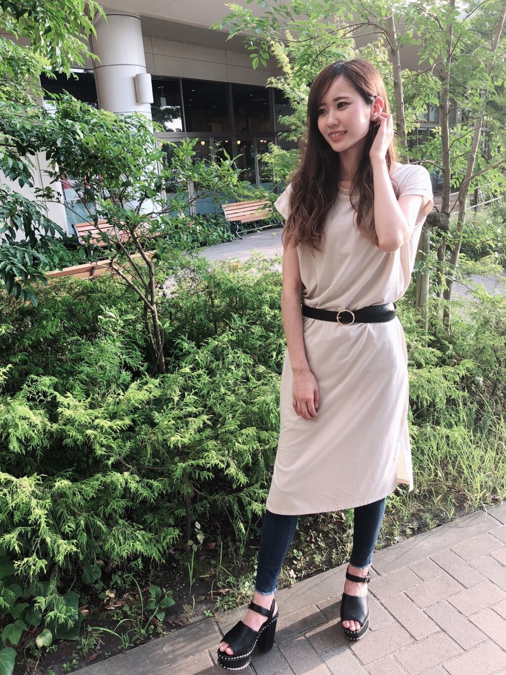 シンプルなカットワンピースはベルトでウエストマークをプラスするのが🙆♀️✨ デニムスキニーでよりカジュアルに😊