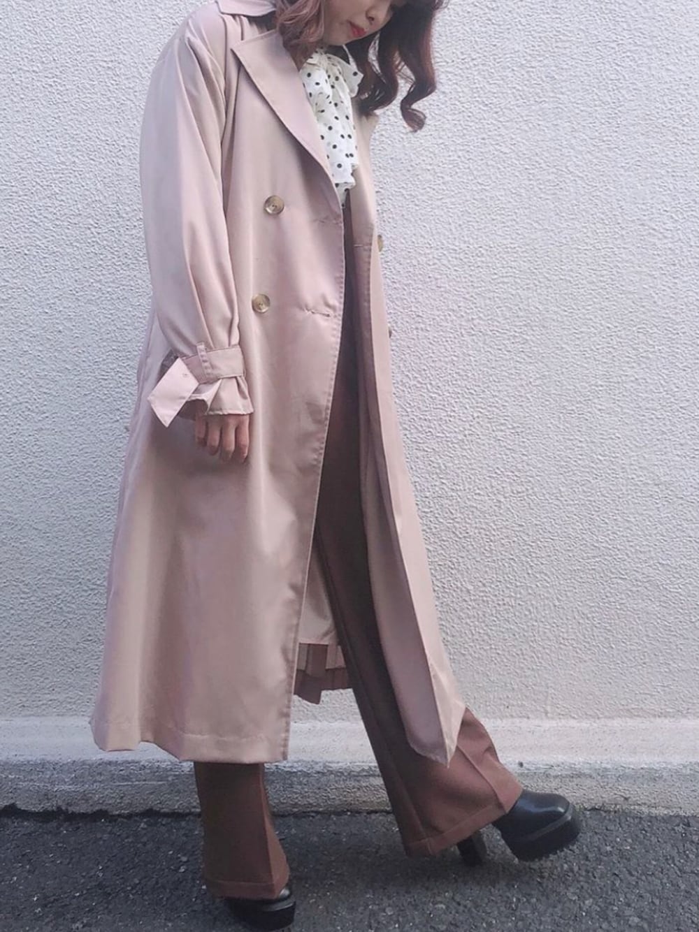 今春も欠かせないトレンチコートはドット柄のトップスをプラスしてトレンド感をプラスするのがオススメ