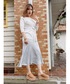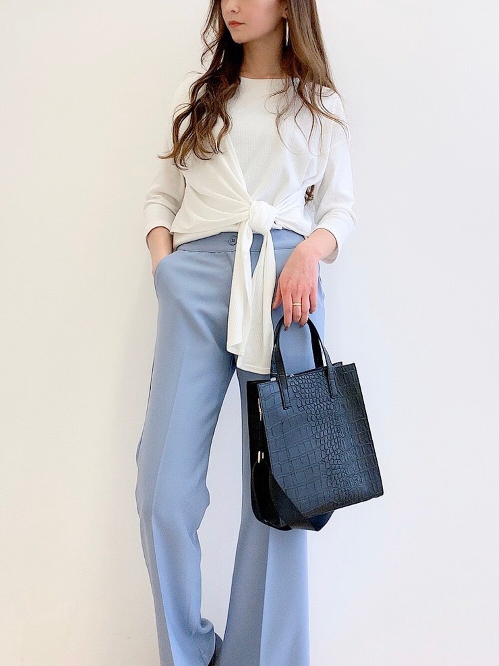 ライトブルーが清涼感漂うパンツはフロント部分のディテールがポイントのトップスと合わせて大人カジュアルなスタイリングに!
