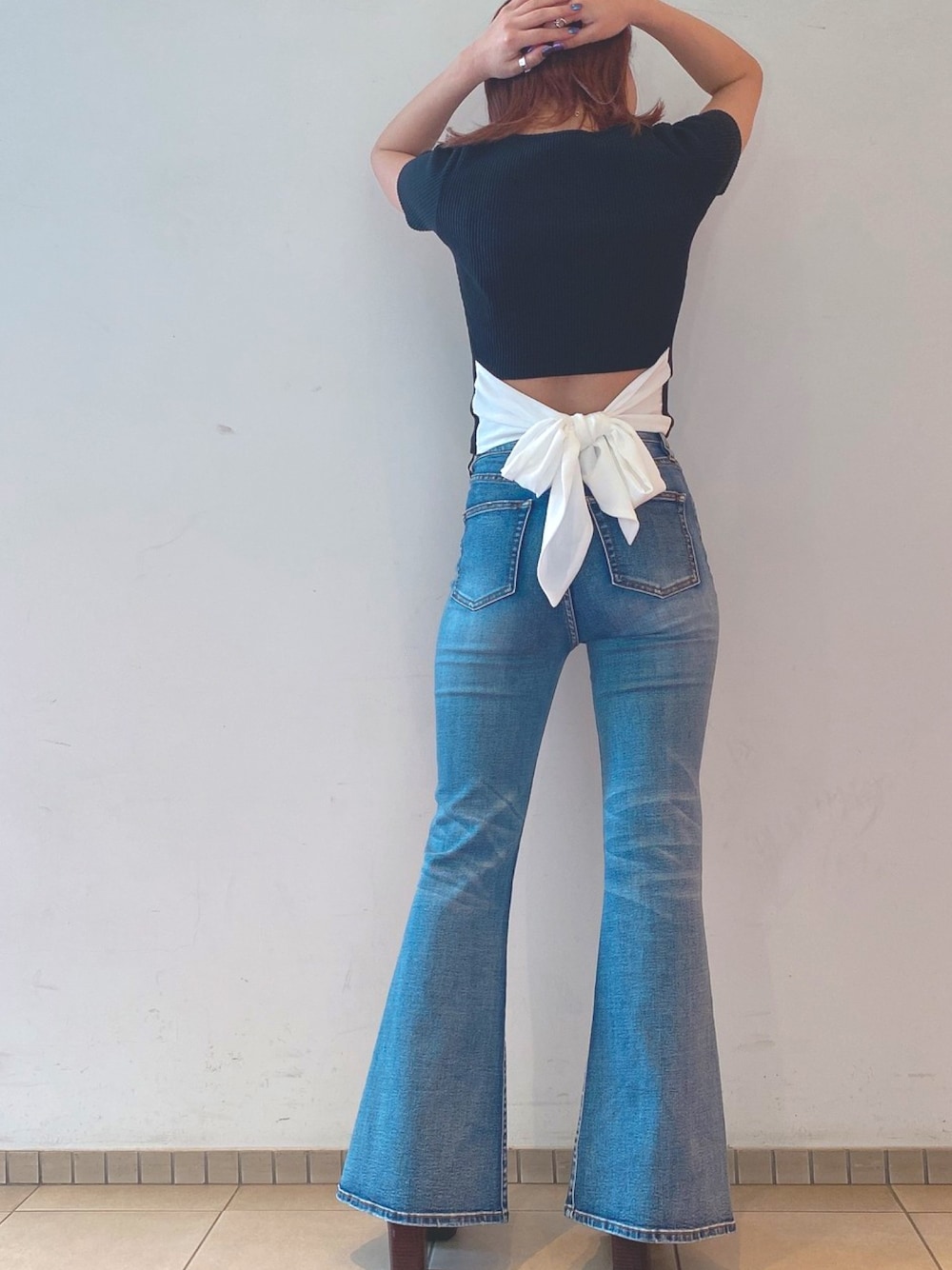 ビックなリボンに肌見せをプラスして、後ろ姿から女度UP! 丈が短めなのでハイウエストのボトムと合わせるのがオススメ♪