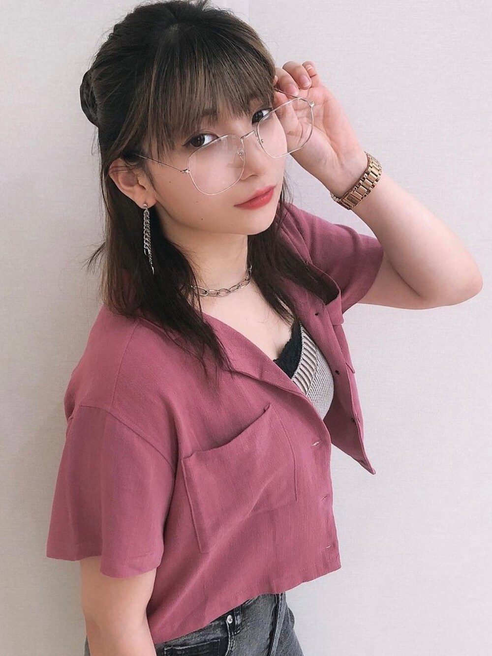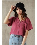 ビビットなパープルがコーディネイトのアクセントになる開襟シャツはピグメント加工のニットビスチェをインナーにしてビンテージ感をプラスするのが◎