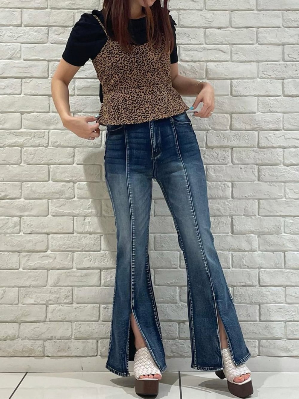 コーディネイトのアクセントになるヒョウ柄はペプラムデザインなので脚長効果抜群!