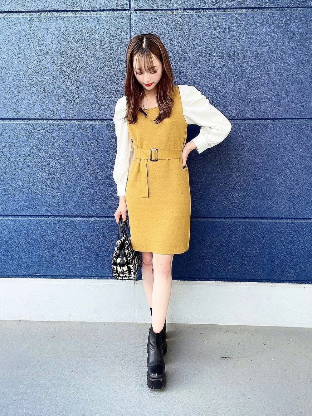 異素材使いがポイントのワンピースはイエローで周りと差がつきます! 共生地のベルトも付いているので簡単にブラウジングができます❤︎