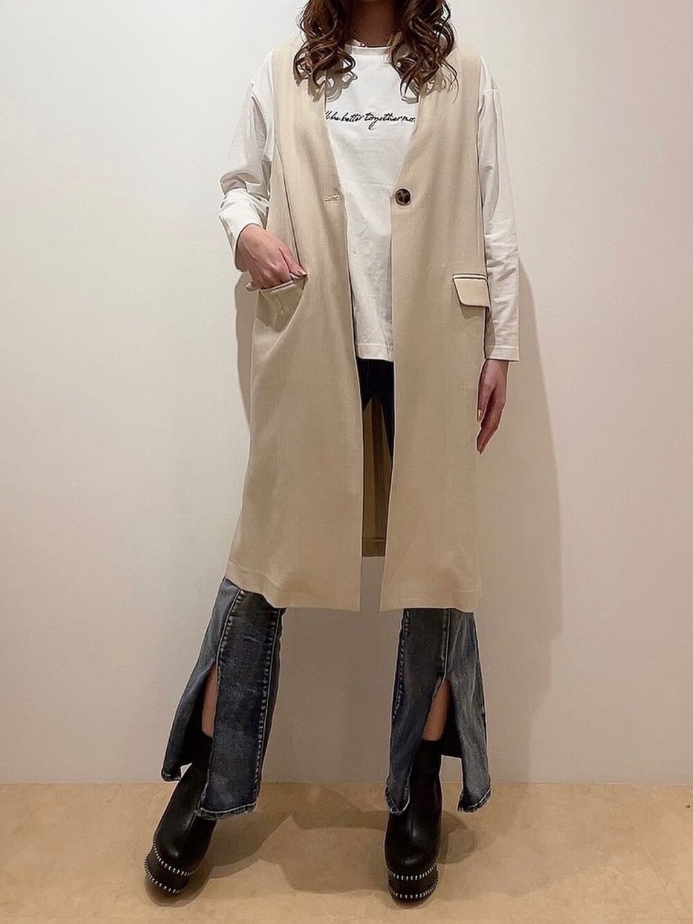 onewayのその他アウター「【oneway】ノーカラーロングベスト」を使ったコーディネート